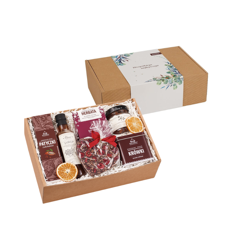 Piękny upominek pełen prezentowych klasyków takich jak konfitura różana, aromatyczna herbata oraz słodycze. Opakowanie ze najlepszymi życzeniami oraz delikatna ozdoba z suszonych pomarańczy sprawiają, że jest to świetna propozycja na prezent dla babci, mamy czy przyjaciółki.